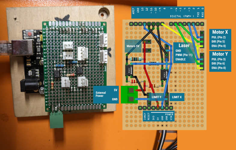 Um zu testen, ob ein unregelmäßig auftretendes Problem mit der Steuerung am Smoothieboard oder den Motoren liegt, wurde die Ansteuerung mit der GRBL Software auf einem Arduino ausprobiert. Dazu wurde ein Adapterboard gelötet, welches auf einen Arduino UNO gesteckt werden kann und die gleichen Stecker (Molex KK 2,54 mm) wie das Smoothieboard bietet, so dass ein Wechsel schnell möglich ist.