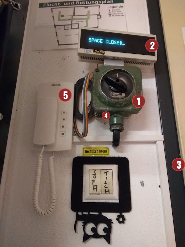 Auf dem Display wird neben anderer Dinge der Spacestatus angezeigt. Dreht man den Schalter (①), sollte dort innerhalb von Sekunden der neue Status erscheinen.